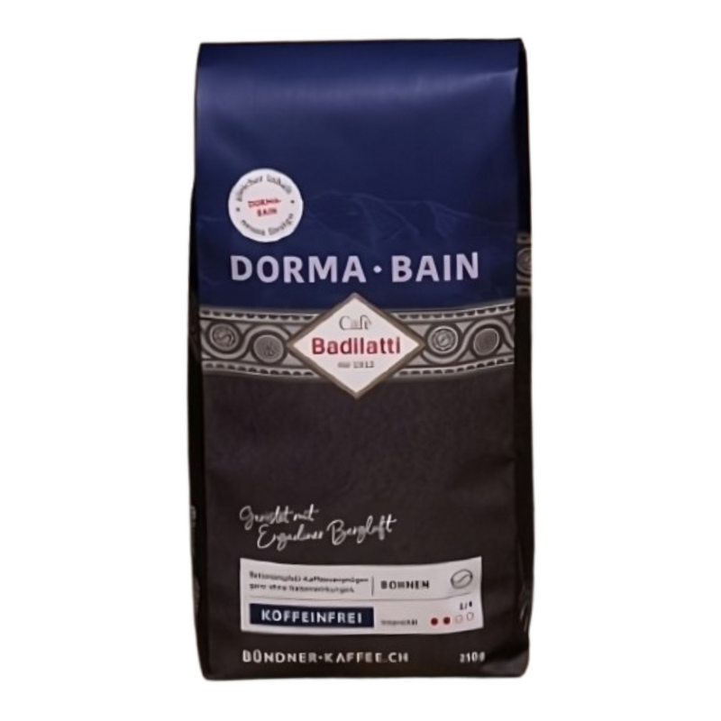Dorma Bain — это кофе без кофеина средней обжарки, продукт швейцарской компании Cafe Badilatti. Уникальная смесь производится из 100% зерен арабики с сертифицированных кофейных плантаций в Мексике, Гондурасе и Колумбии. «Dorma bain» на ретороманском означает «крепкий сон». Как следует из названия кофе без кофеина, вы можете наслаждаться им в любое время дня и ночи. Вкус Dorma Bain завораживает своим насыщенным характером, тонкими ореховыми нотками и приятной кислинкой. Благодаря щадящему декофеинированию и легкой обжарке сохраняется вся гамма ароматов кофе.